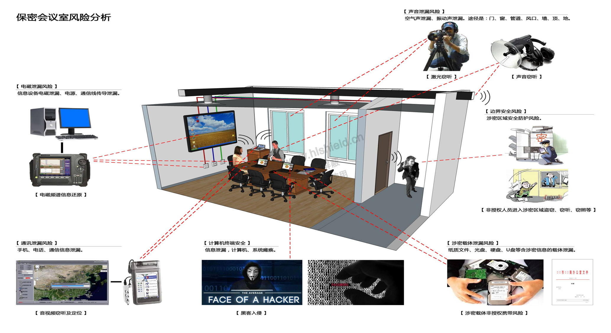 目前,隨著黨政機(jī)關(guān)、科研機(jī)構(gòu)、國防軍工和國有企業(yè)等單位的工作會(huì)議、技術(shù)交流、項(xiàng)目匯報(bào)、科研講座的增多,對(duì)現(xiàn)代視訊展示、數(shù)碼電聲處理、自動(dòng)化電器處理等組成的多媒體聲、光、像會(huì)議系統(tǒng)和保密防護(hù)技術(shù)的需求越來越強(qiáng)烈。我們根據(jù)其實(shí)際應(yīng)用和需求,依據(jù)國家保密標(biāo)準(zhǔn)BMB26-2012《保密會(huì)議室保密要求和測試方法》的規(guī)定,結(jié)合會(huì)議涉及的涉密信息等級(jí),對(duì)重要區(qū)域采取先進(jìn)的防護(hù)技術(shù)手段,我公司推出了保密會(huì)議室等重要區(qū)域的整體解決方案及系列專用產(chǎn)品,在功能和性能方面完全滿足各級(jí)保密部門不同密級(jí)的防護(hù)需求。